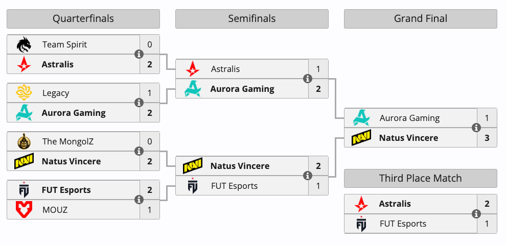 Nas semifinais, a NAVI derrotou a FUT por 2 a 1 e garantiu vaga na decisão. Do outro lado, a Aurora venceu a Astralis, também por 2 a 1. Antes da grande final, a Astralis ficou com o terceiro lugar ao derrotar a FUT Esports.