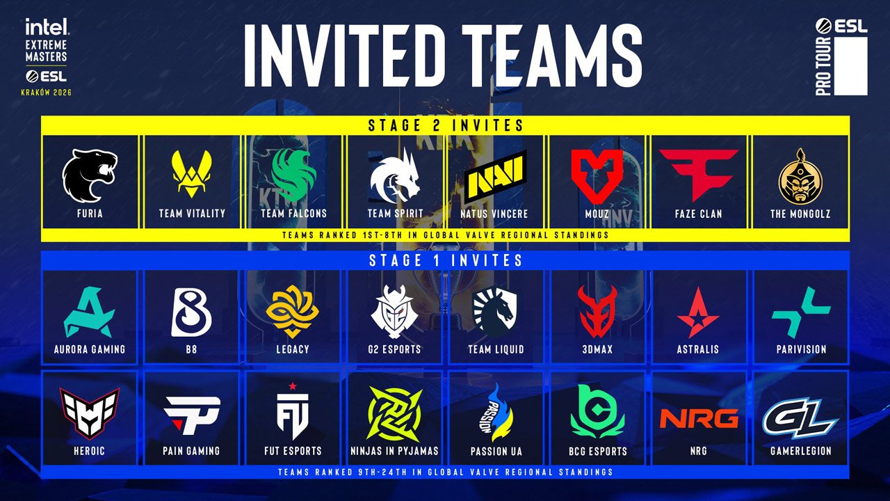 A ESL divulgou oficialmente os convites e o formato para as etapas 1 e 2 do IEM Kraków, evento que integra o calendário da temporada de 2026. O torneio, que é o primeiro evento ESL Pro Tour Championship realizado em Kraków, na Polônia, acontecerá entre os dias 28 de janeiro e 8 de fevereiro.