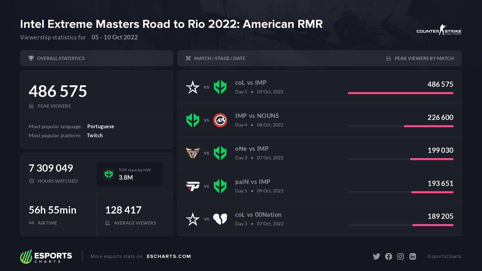 Além da vaga para o IEM Rio Major, a Imperial finalizou o RMR das Américas protagonizando quatro das cinco partidas mais assistidas do torneio. As informações são do Esports Charts.
