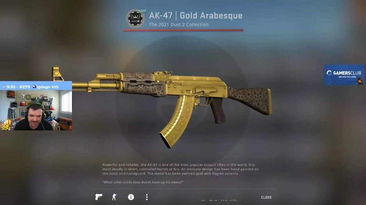 Durante uma transmissão exibida nesta semana, Alexandre “Gaules” Borba revelou que adquiriu a nova AK-47 Gold Arabesque, que veio junto da Operação Correnteza, com um float de 0.0013. Além da sua skin, Gaules também comprou outra AK para Letícia “lett” Pereira, esta com um float de 0.05.