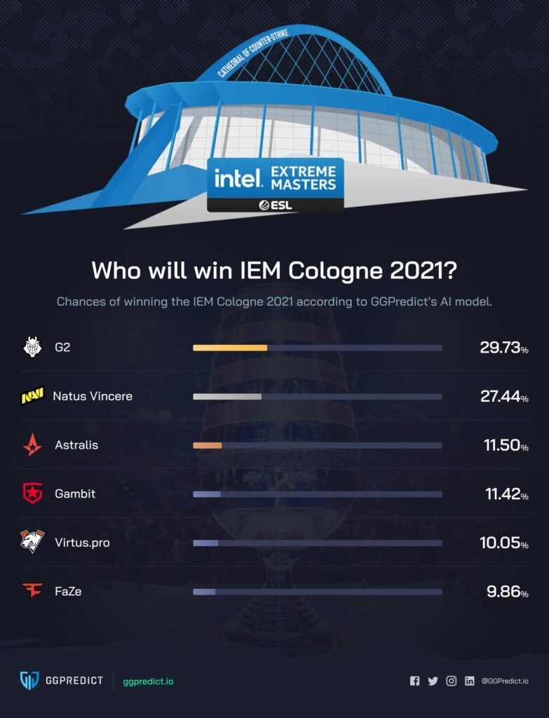 O site GG Predict, especializado em previsões de resultados baseadas em inteligência artificial, publicou nesta quarta-feira (14) que a G2 deverá ser a campeã do IEM Cologne 2021. Nas primeiras simulações, ainda na fase de Play-ins, o site apontou que a Natus Vincere, de s1mple, detinha a maior chance de erguer o troféu.