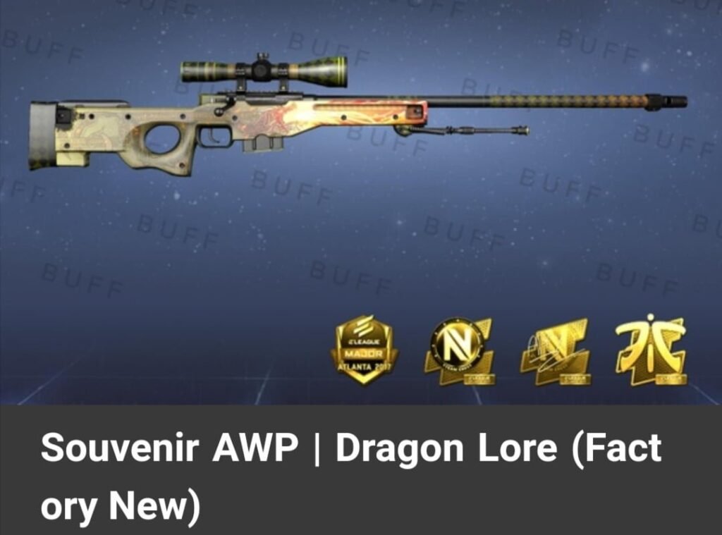 Vendida em uma plataforma chinesa, a AWP Dragon Lore com adesivos do ELEAGUE Major Atlanta 2017 aparece como uma das mais caras do jogo. Os adesivos são em referência ao duelo entre Envy e Fnatic.