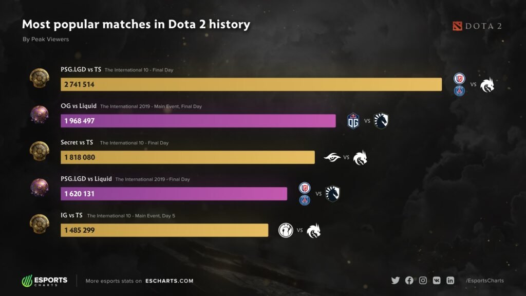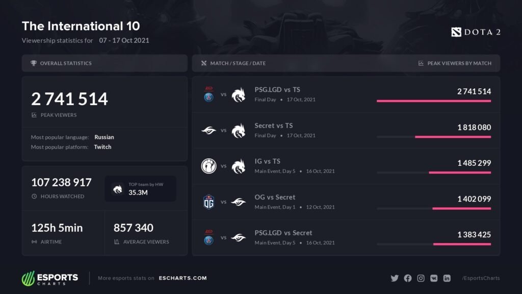O The International 10 se tornou o campeonato com a maior audiência de toda a história do Dota 2, segundo dados levantados pelo Esports Charts. Isso porque a final entre PSG e Spirit teve um pico de 2.741.514 espectadores simultâneos, o que a fez ser, disparada, a partida mais vista do MOBA até hoje.