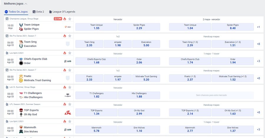 Em League of Legends, por exemplo, é possível escolher o time que será o primeiro a derrubar o Barão ou a primeira torre. Além disso, as apostas mais tradicionais, como vencedor da série e de cada partida também estão liberadas. O mesmo vale para o Counter-Strike, mas com tipos de apostas voltadas para a modalidade do FPS.