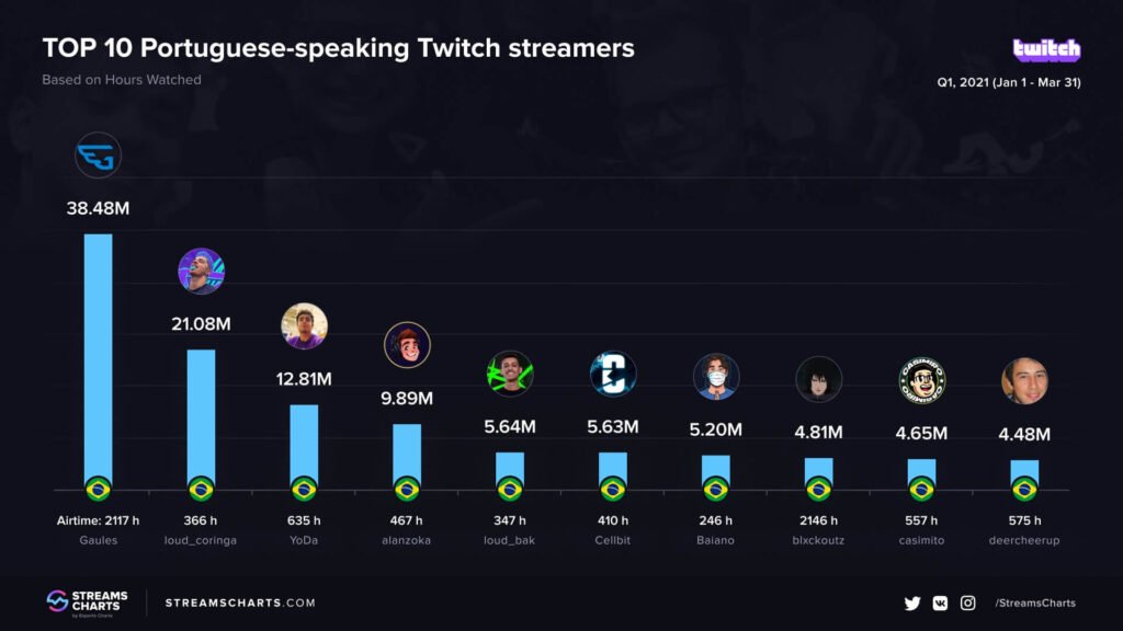 A Stream Charts, plataforma especialista em analisar dados relacionados às transmissões na Twitch, divulgou nesta quinta-feira (21) os 10 canais de língua portuguesa mais assistidos no primeiro trimestre de 2021.