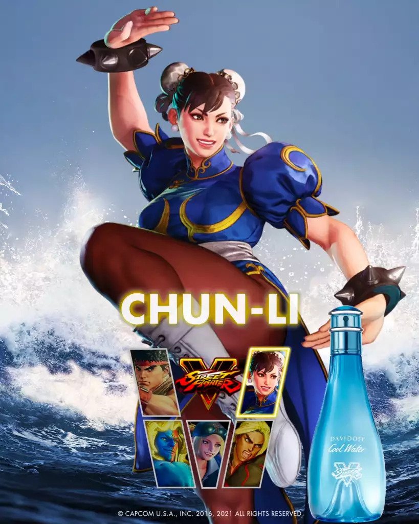 Já a versão feminina, o Cool Water For Her, é inspirado no estilo de luta único e na feminilidade da famosa lutadora Chun-Li e combina notas de pera e tangerina. “Combinando pura energia e graça, o perfume captura perfeitamente a quintessência da lutadora de kung fu”, diz a empresa.