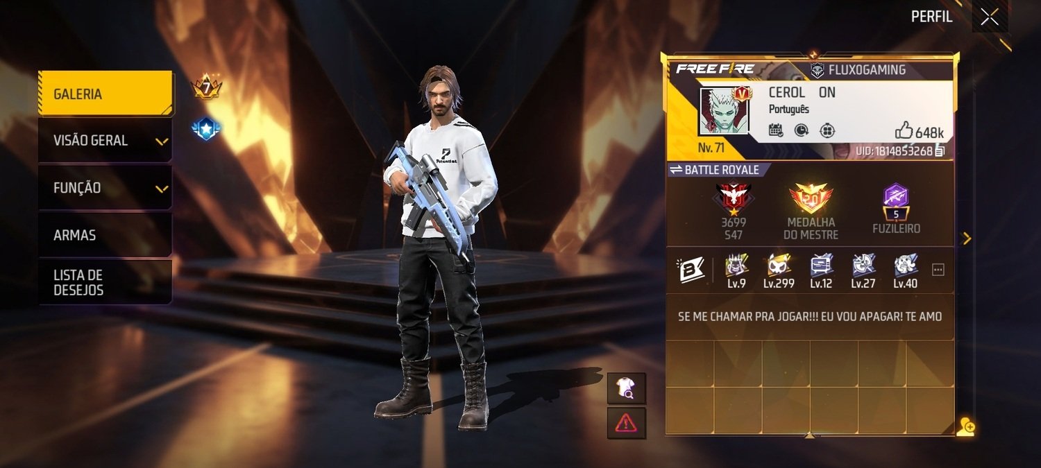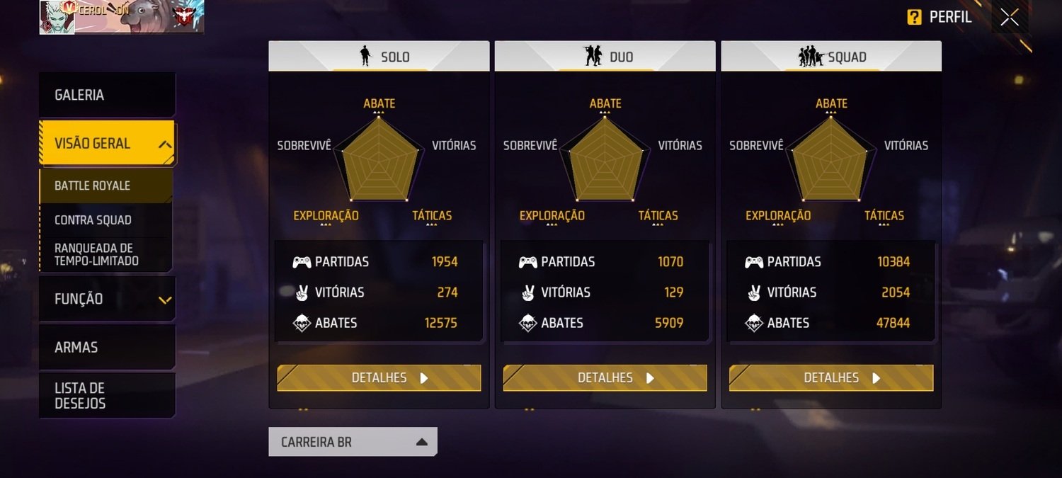 Até 19 de setembro de 2025, Cerol possuía as seguintes estatísticas no modo Battle Royale de Free Fire: