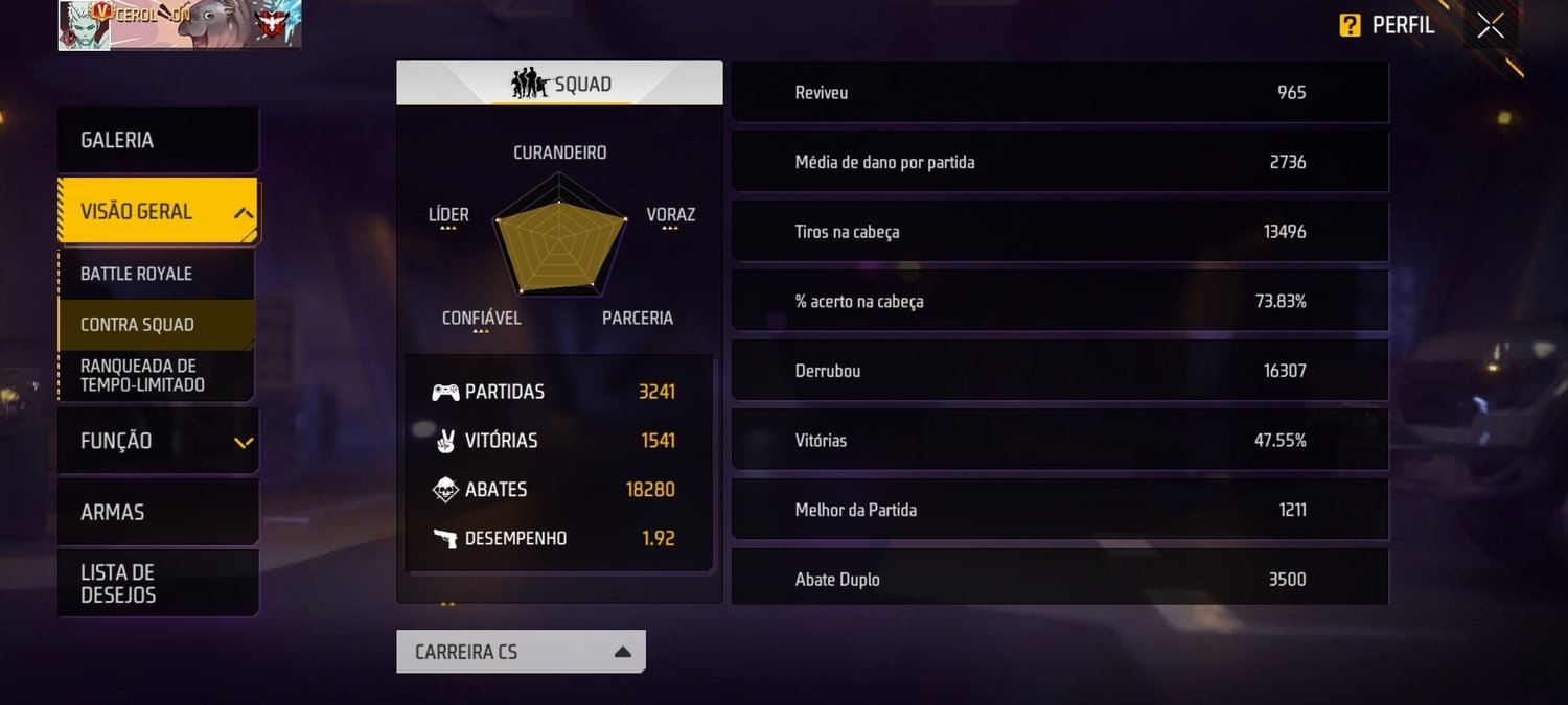 Até 19 de setembro de 2025, Cerol possuía as seguintes estatísticas no modo Contra Squad de Free Fire: