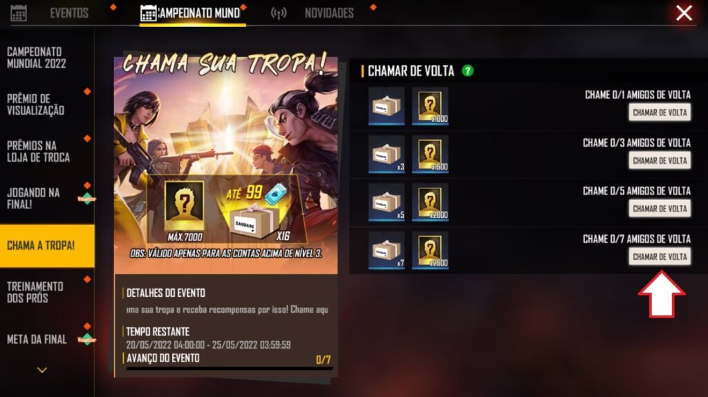 2- Caso tenha selecionado o ícone de eventos, toque na aba “Campeonato Mundial de Free Fire 2022 – FFWS” e procure por “Chama a Tropa!“. Em seguida, toque em um dos botões “Chamar de Volta“.