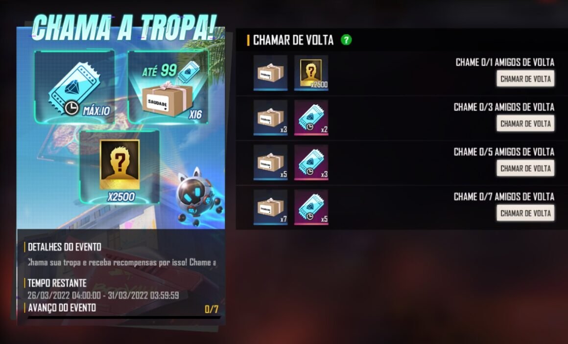 Um novo evento “Chama a Tropa!” chegou ao Free Fire neste sábado (26) e ficará disponível até quinta-feira (31). A dinâmica já é conhecida pelos jogadores e consiste em convidar amigos que estão há muito tempo sem jogar de volta ao battle royale.