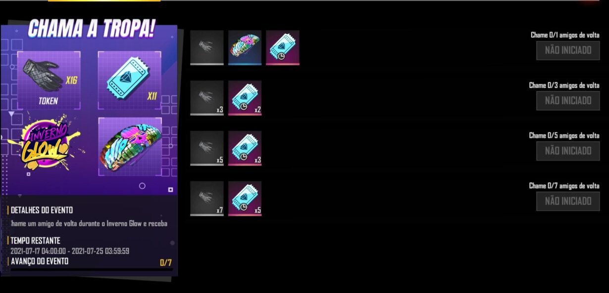 Ao invés dos diamantes, os jogadores coletarão 11 tickets de diamante para abrir caixas. Além disso, também estarão disponíveis outros dois cosméticos que fazem parte do Inverno Glow, evento ativo atualmente no Free Fire. Assim, ao chamar pelo menos um amigo de volta ao Free Fire, será possível resgatar o Paraquedas Glow.