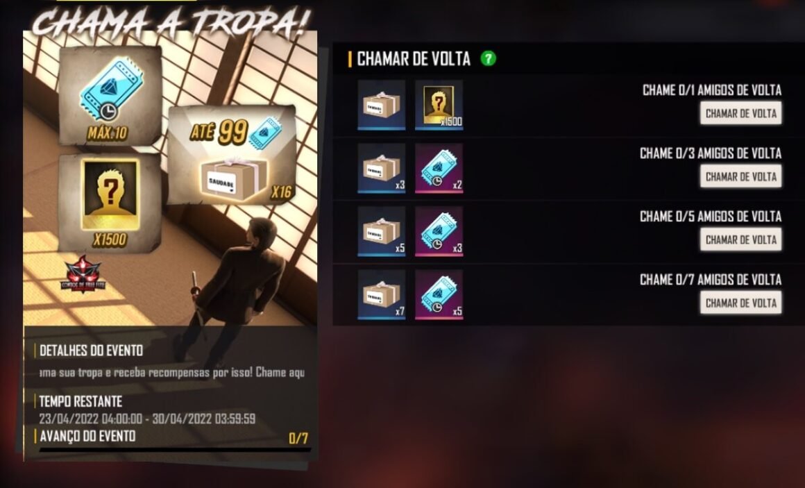 Um novo evento “Chama a Tropa!”, parte do Contos de Free Fire, chegou ao jogo neste sábado (23) e ficará disponível por sete dias, ou seja, até sábado que vem (30). A dinâmica já é bem conhecida pelos jogadores e consiste em convidar amigos que estão há muito tempo sem jogar de volta ao battle royale.
