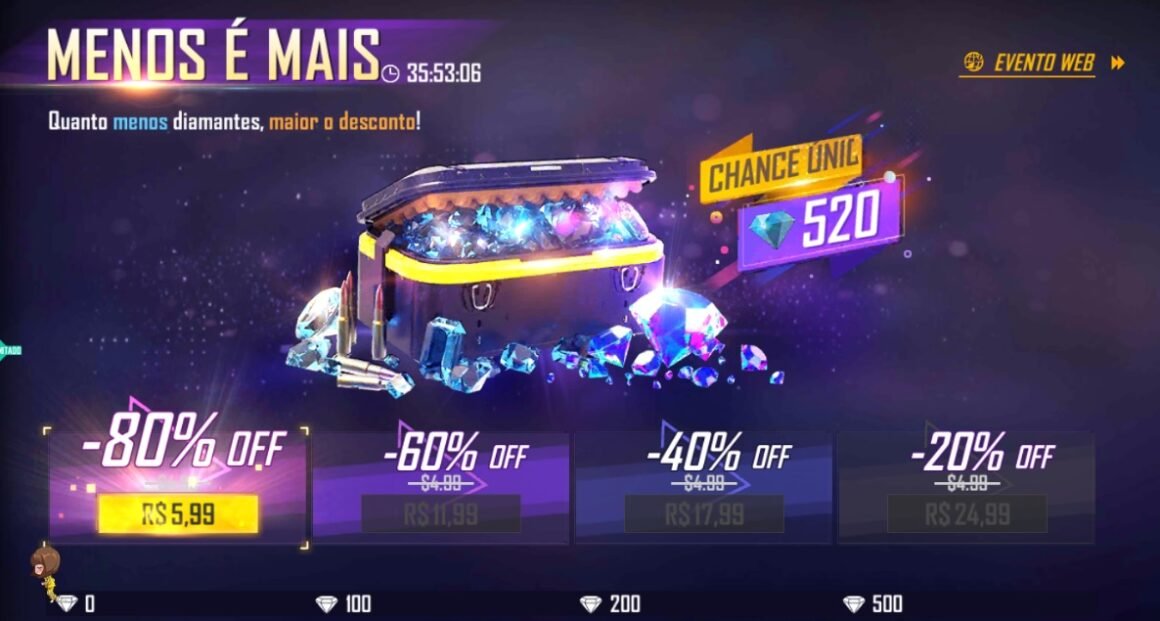 Um novo evento de recarga chegou nesta quinta-feira (3) ao Free Fire e está oferecendo diamantes com até 80% de desconto. A promoção é válida apenas para o pacote de 520 diamantes, e o desconto depende da quantidade de moedas que o jogador possuir na conta. Quanto menor for, maior o desconto.
