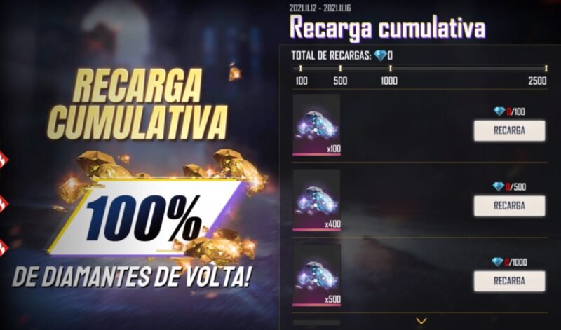 A Garena disponibilizou nesta sexta-feira (12) para o Free Fire o evento Recarga Cumulativa, com a possibilidade dos jogadores recolherem bônus grandes de diamantes. Vale ressaltar que na primeira recarga de 100 diamantes, o usuário recebe um bônus de 100%.
