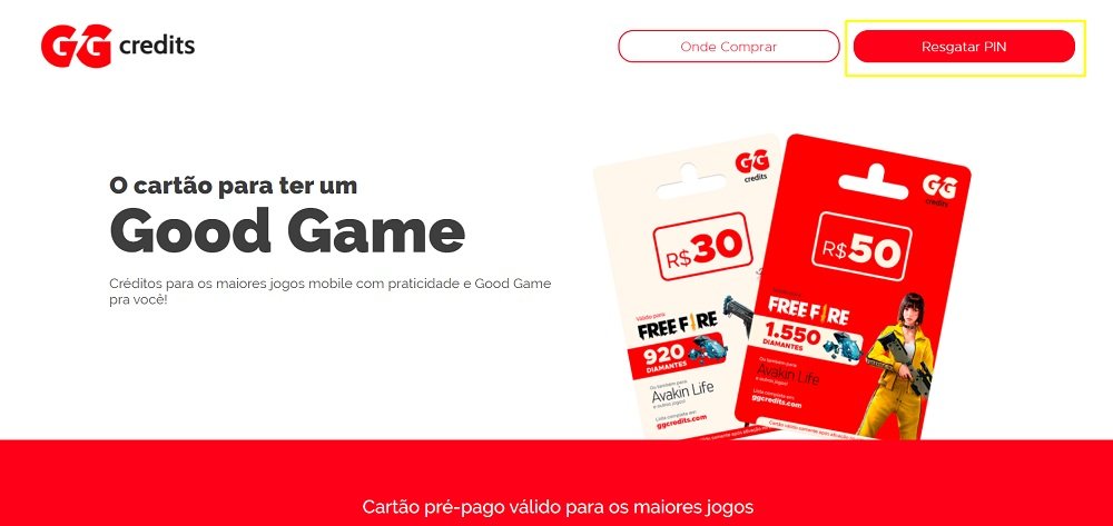 Após comprar o cartão pré-pago ou adquirir o pin digital em um dos estabelecimentos indicados acima, o jogador precisa acessar o site oficial do GGCredits para conseguir resgatar os diamantes no Free Fire. Desta forma, é possível entrar no site por meio deste link. Após acessá-lo, clique em “Resgatar PIN” no canto superior direito.