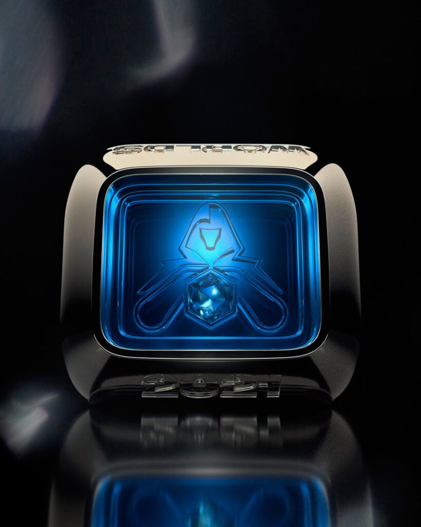 Os anéis trazem todas as características visuais da edição desta temporada, realizada em Reykjavík, capital da Islândia, com detalhes em prata e azul. Além disso, as peças contarão com a escrita “WORLDS 2021” impressa em baixo relevo. Confira como ficou o anel de campeão abaixo.