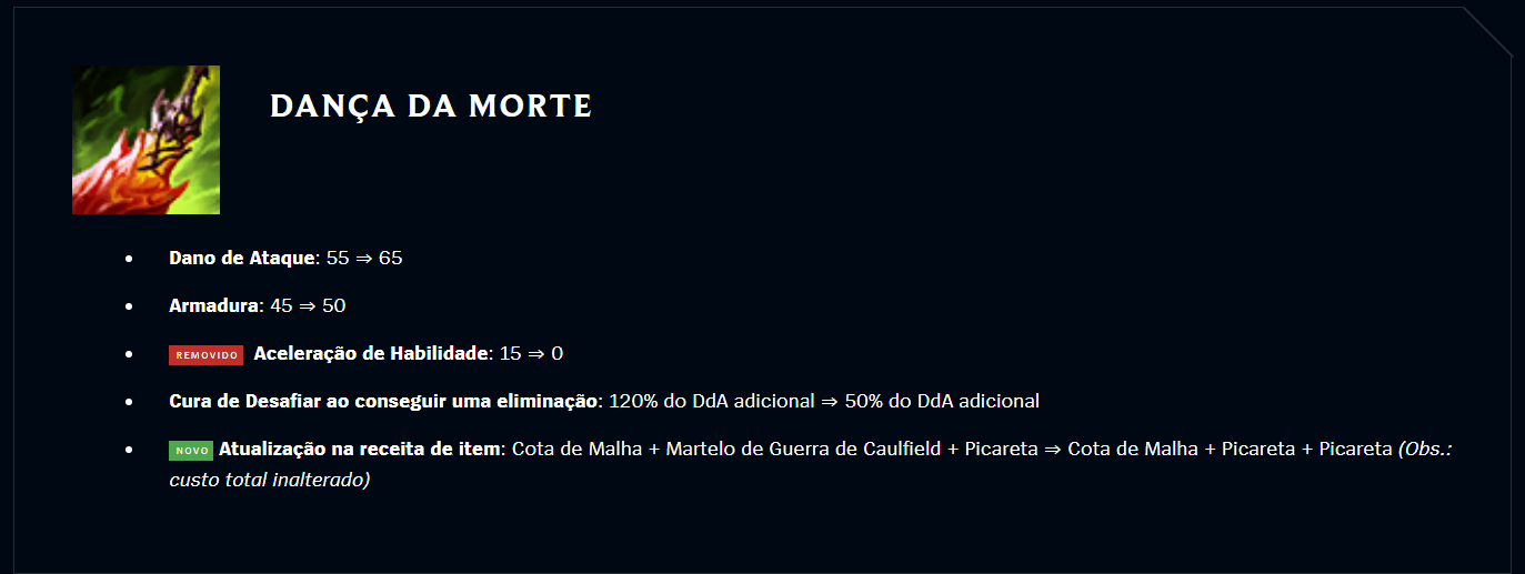Os itens que tiveram mudanças foram os seguintes: Cutelo Negro, Eclipse, Hemodrenário, Hidra Raivosa, Mandíbula de Malmortius e Dança da Morte.