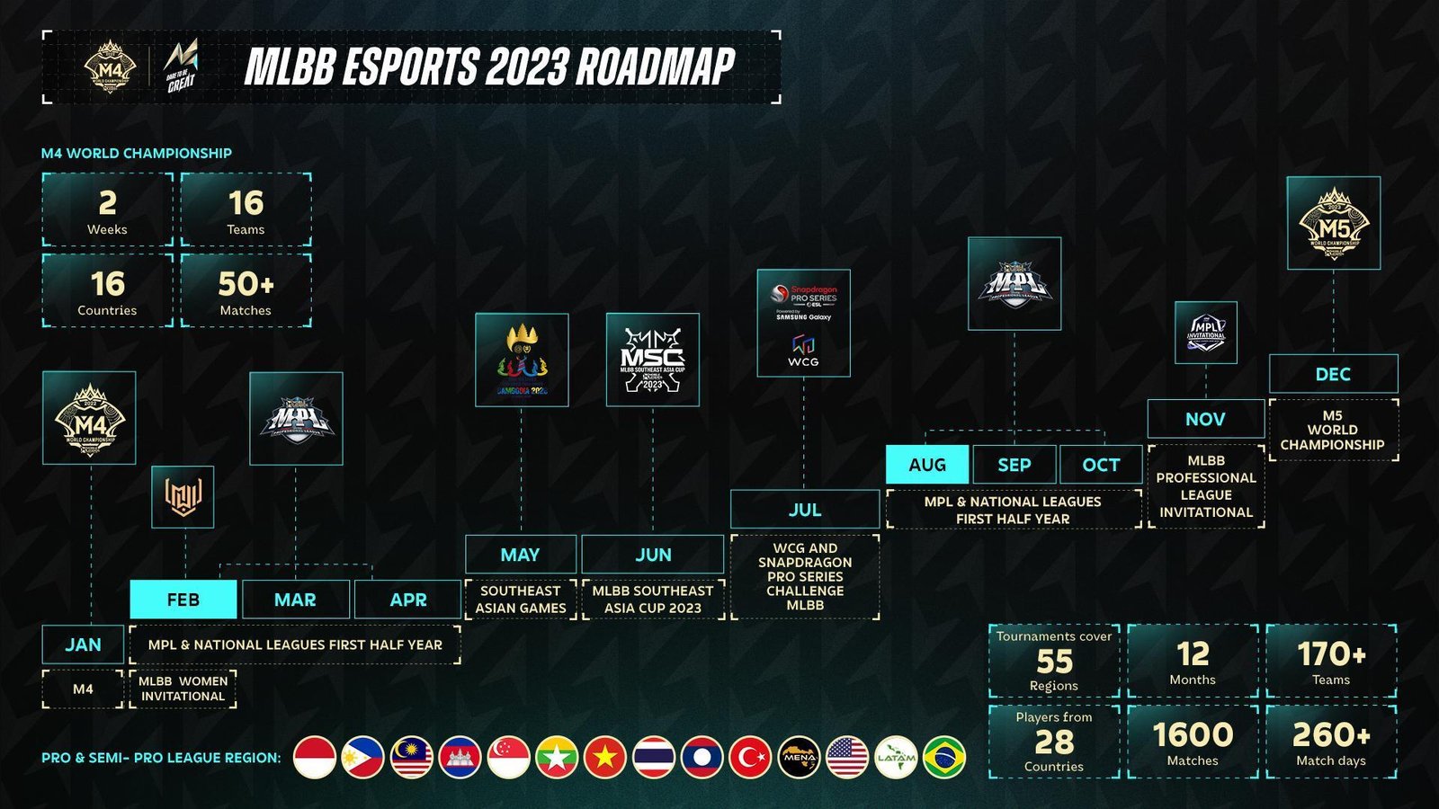 Neste mesmo período, acontecem outros campeonatos profissionais, como Turkey Qualifiers (Turquia), Mobile Legends: Bang Bang Super League (América Latina) e North America Community Tournament (América do Norte). Já no meio do ano, entre maio e julho, serão realizados os SEA Games 2023 e o MSC 2023.