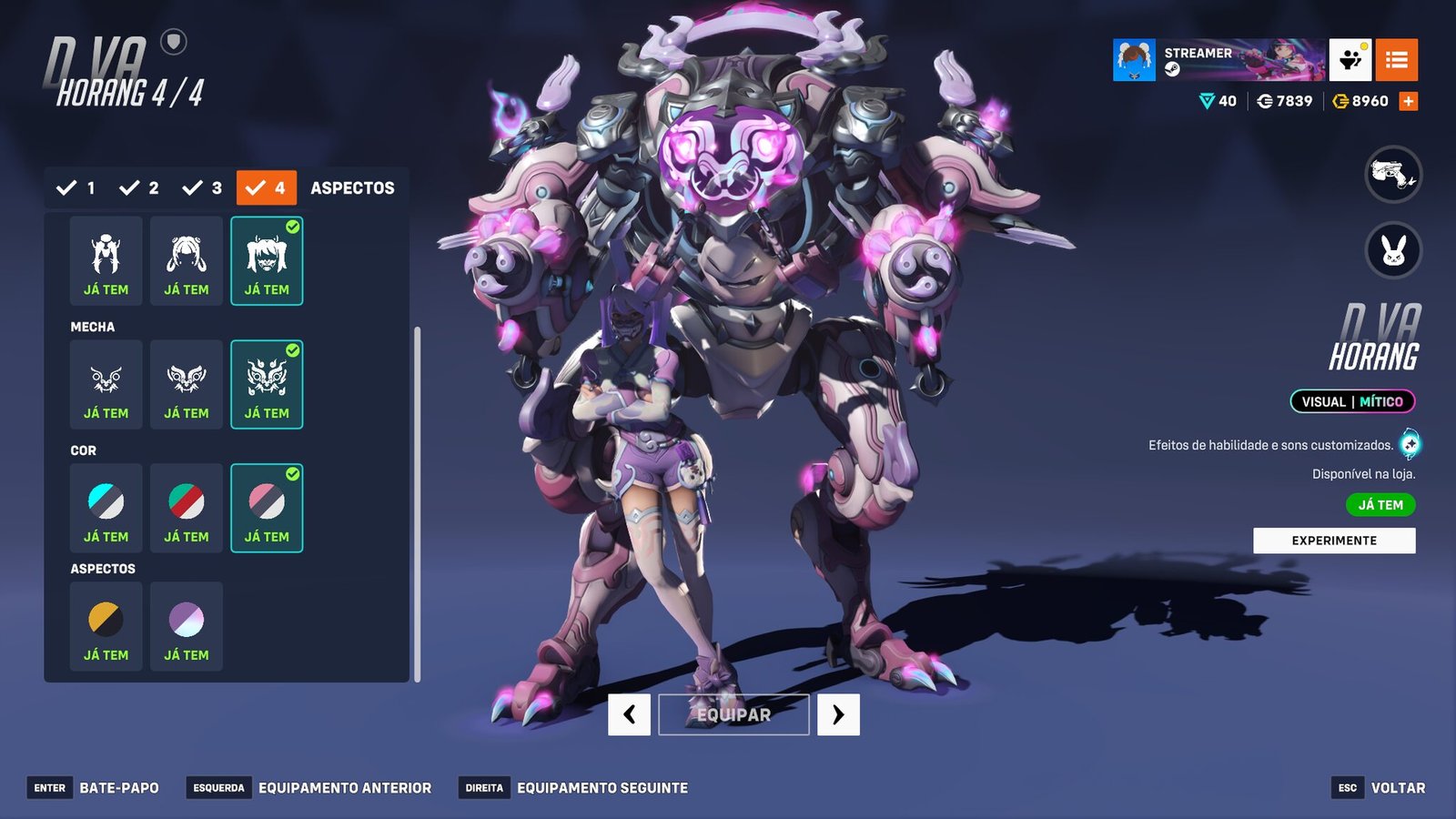 Sem dúvidas, um dos destaques da Temporada 17 é a skin Horang, o novo visual mítico da tanque D.Va. Com os Prismas obtidos no Passe, o jogador pode aprimorar a skin e personalizá-la com diversas opções de estilo. Olha, usei toda a minha reserva de Prismas pra desbloquear 100% dela!