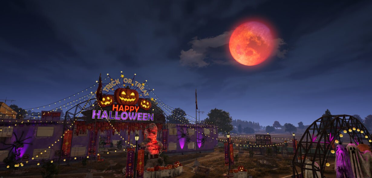 Erangel já estará decorado para o Halloween (foto de capa), trazendo novos efeitos climáticos exclusivos, como a lua com coloração única e neblina em certas áreas do mapa.