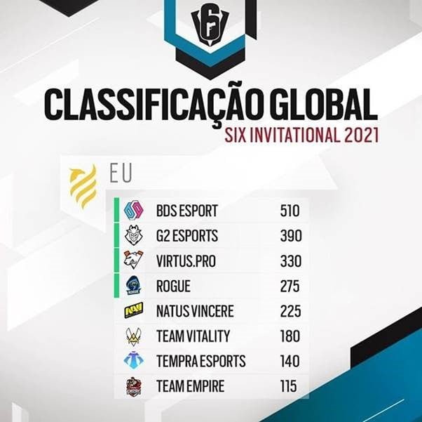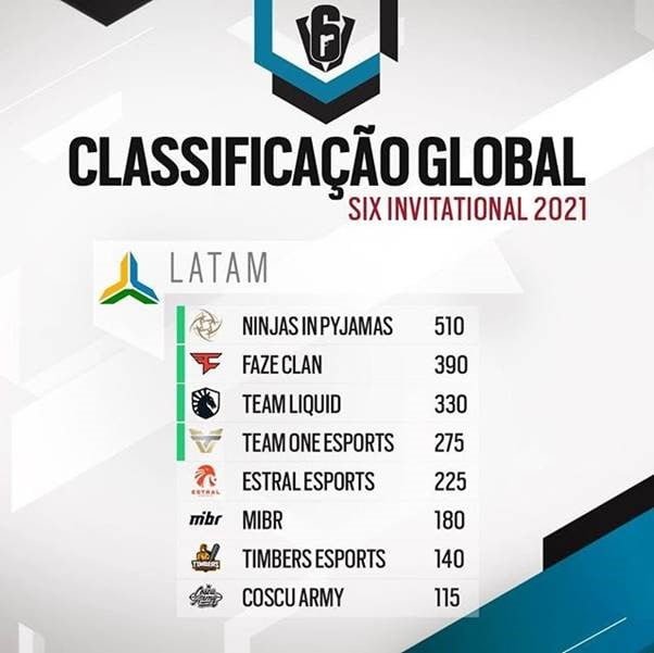 Com a renovação do cenário competitivo mundial de Rainbow Six feito pela Ubisoft em 2020, um novo sistema de pontuação global foi criado para as equipes que buscam a classificação para o Six Invitational, maior torneio oficial do ano. Na região latino-americana, os elencos brasileiros de Ninjas in Pyjamas, FaZe Clan, Team Liquid e Team oNe saíram na frente e estão na zona de classificação.