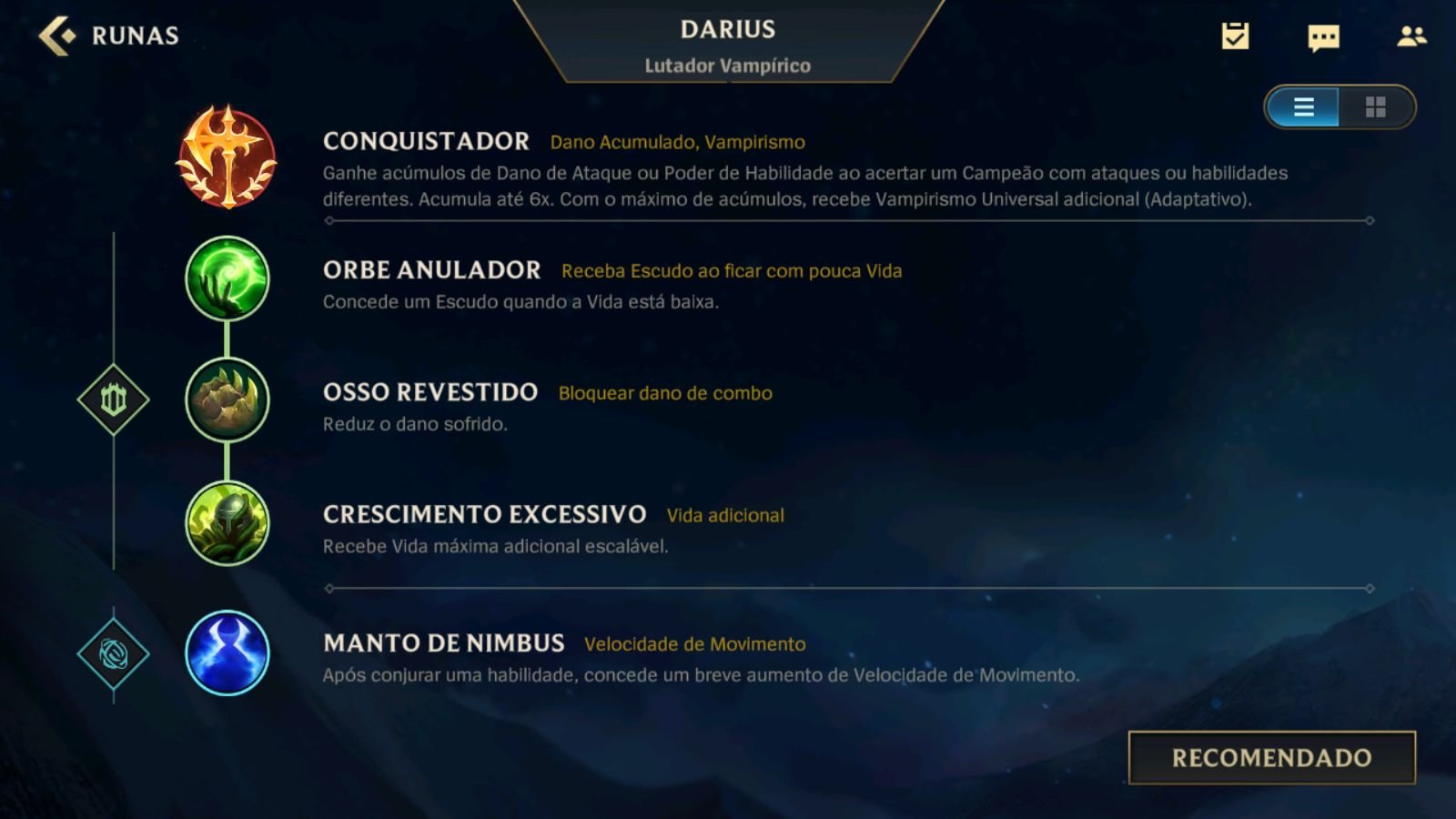 A runa principal de Darius no Wild Rift deve ser Conquistador, para que o campeão possa causar dano e ganhar sustentação em confrontos prolongados. As runas secundárias são as seguintes: