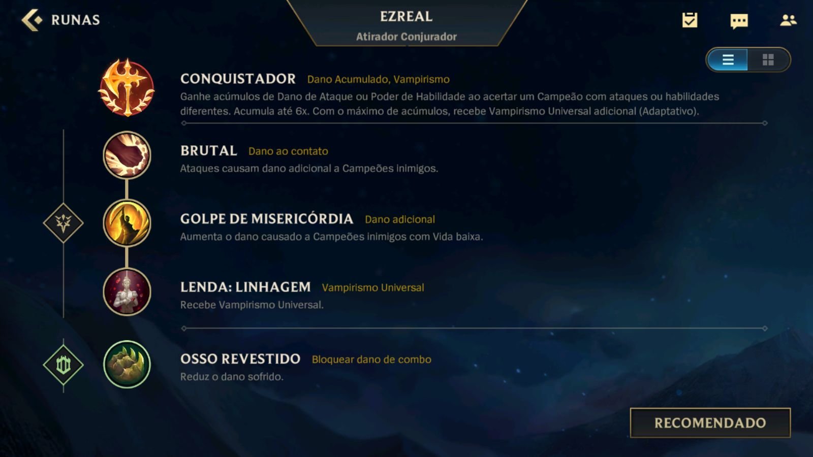A runa principal de Ezreal no Wild Rift deve ser Conquistador por conta do dano e sustentação concedido em trocas longas. As runas secundárias são as seguintes: