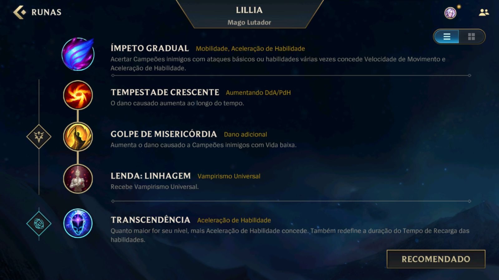 A runa principal de Lillia no Wild Rift deve ser Ímpeto Gradual, opção que garante bastante mobilidade para a campeã quando se usa suas habilidades. As runas secundárias são as seguintes: