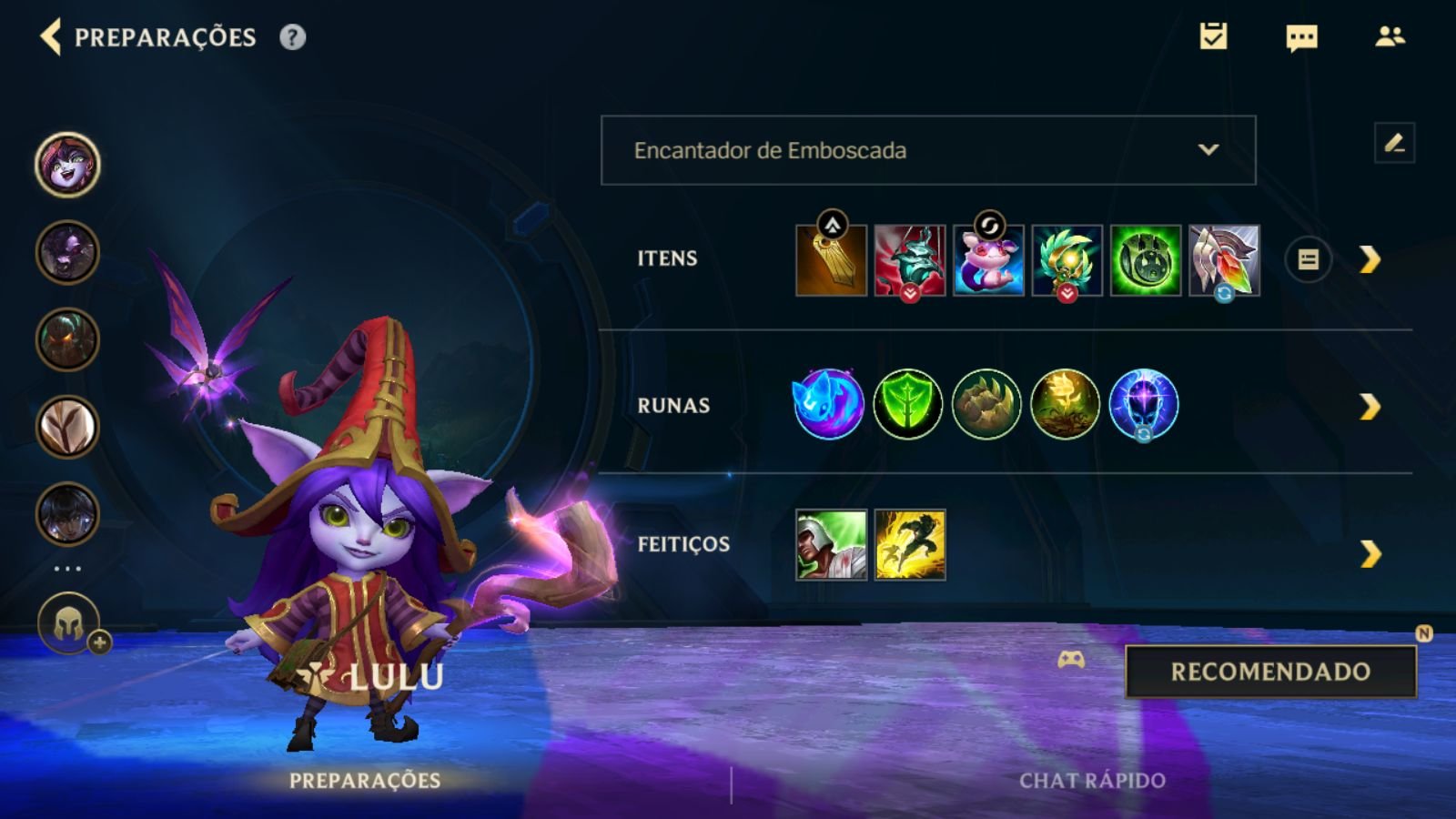 Para Lulu, as melhores escolhas para os feitiços de invocador são Flash e Curar.