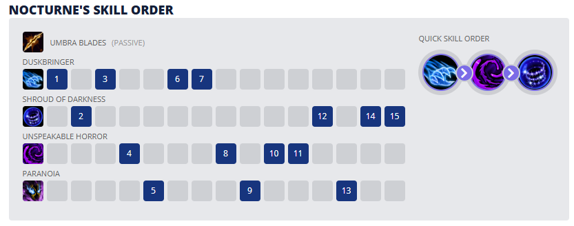 Passiva: Lâminas Sombrias: A cada poucos segundos, o próximo ataque de Nocturne atingirá os inimigos ao seu redor para causar dano físico adicional e curá-lo. Os ataques básicos de Nocturne reduzem esse tempo de recarga.