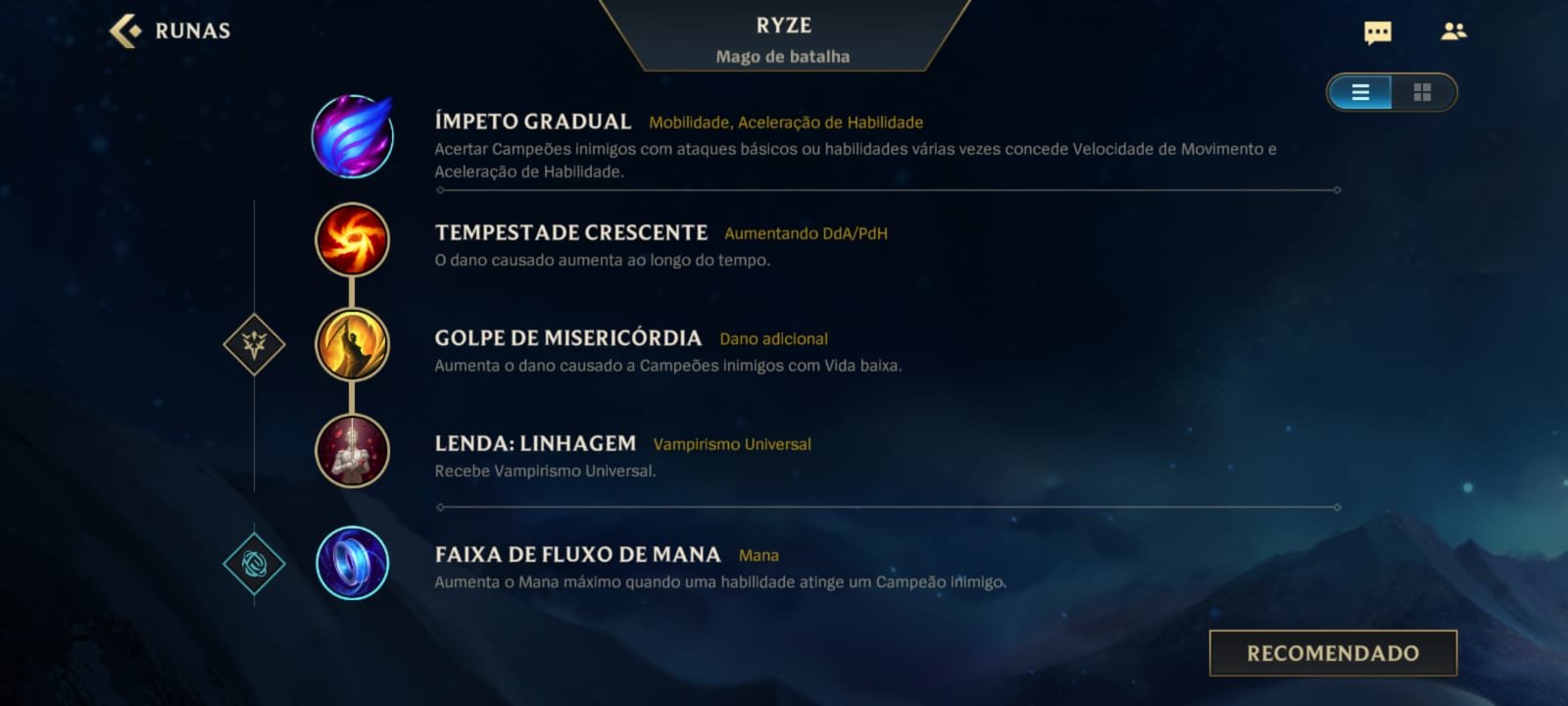 A runa principal de Ryze no Wild Rift deve ser Ímpeto Gradual, opção que garante bastante mobilidade para o campeão quando se usa suas habilidades. As runas secundárias são as seguintes: