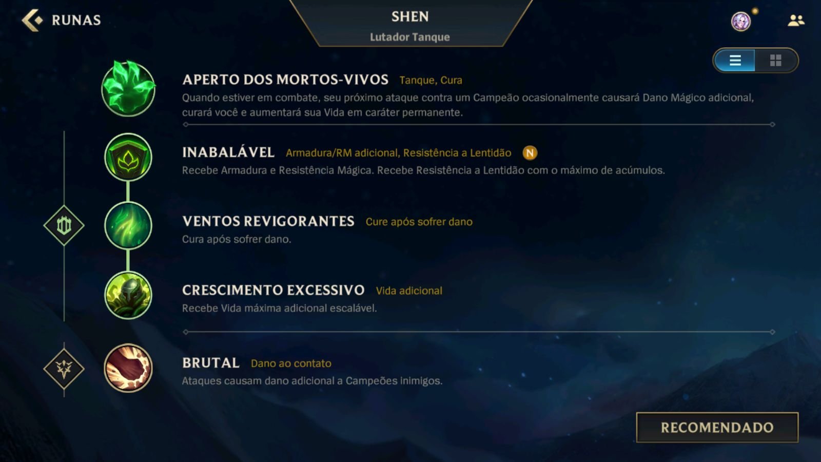 A runa principal de Shen no top deve ser Aperto dos Mortos-Vivos, para que o campeão possa aumentar seu dano e sua sustentação ao longo do jogo. As runas secundárias são as seguintes: