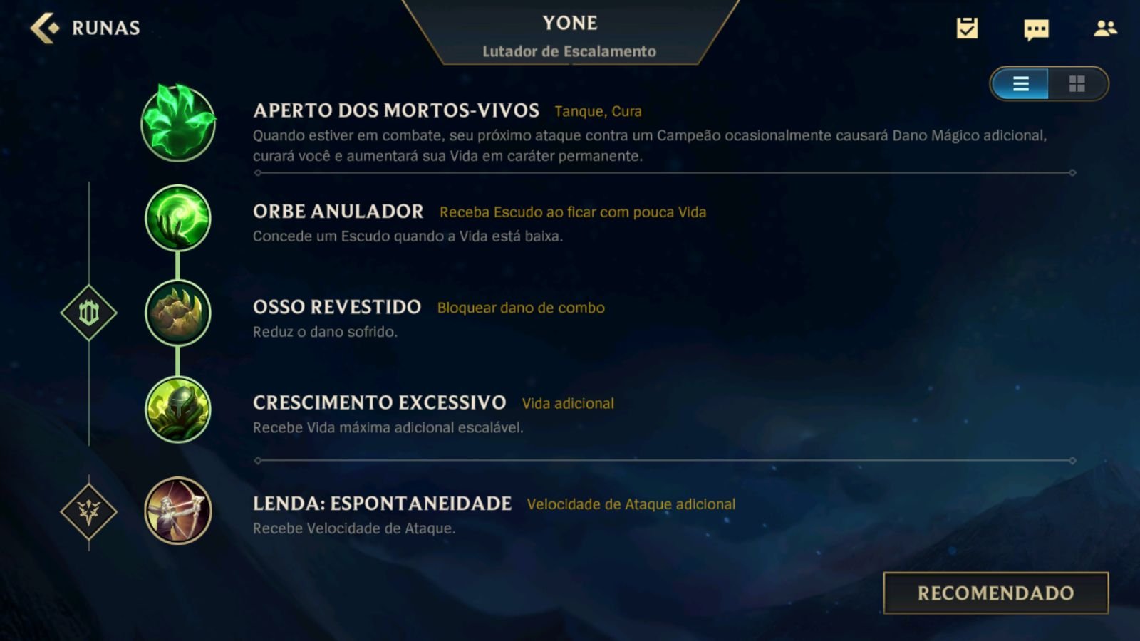 A runa principal de Yone no Wild Rift deve ser deve ser Aperto dos Mortos-Vivos para que ele possa ganhar sustentação em trocas curtas de dano. As runas secundárias são as seguintes: