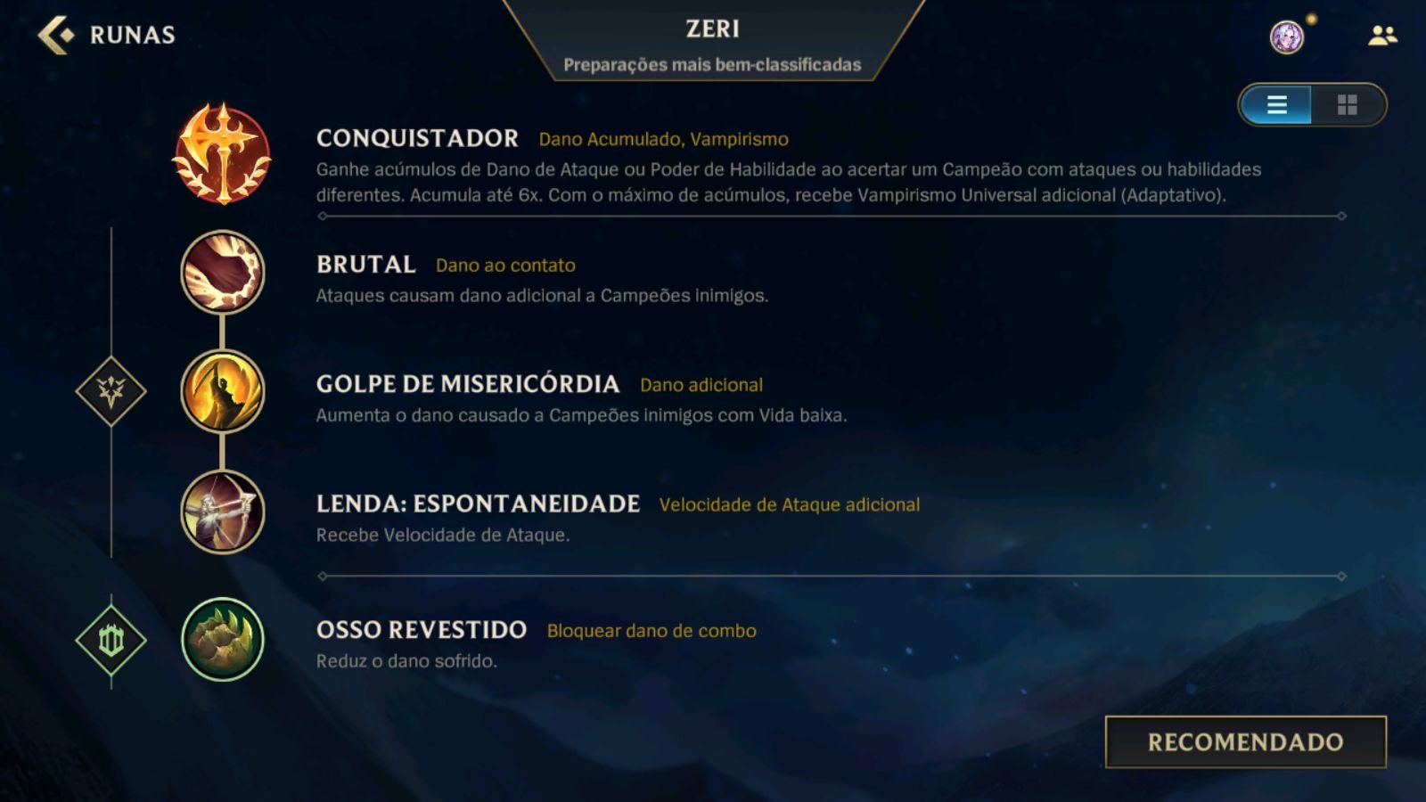 A runa principal de Zeri no Wild Rift deve ser Conquistador por conta do dano e sustentação concedido em trocas longas. As runas secundárias são as seguintes: