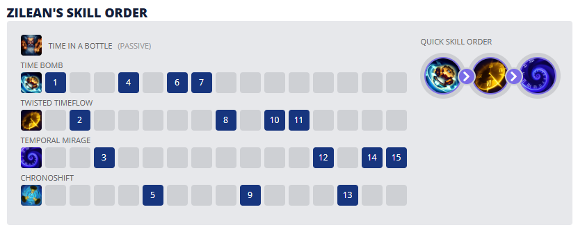 Passiva: Tempo Engarrafado: Armazena o tempo como experiência a uma taxa de 20 EXP por 5 segundos. Zilean poderá conceder essa experiência ao campeão aliado mais próximo quando tiver o suficiente para subir um nível deste campeão. Zilean receberá a mesma quantidade de EXP.